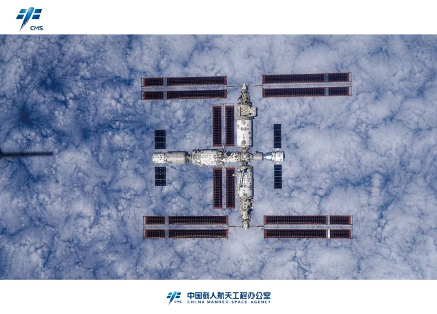 11月28日,中国载人航天工程办公室发布了神舟十六号乘组返回地面前手持高清相机通过飞船绕飞拍摄的空间站组合体全景照片。这是我国首次在轨获取以地球为背景的空间站组合体全貌图像,也是中国空间站的第一组全构型工作照。