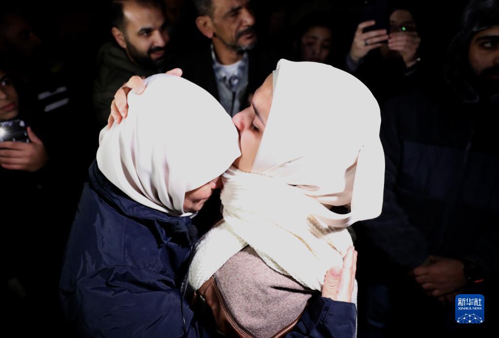 11月29日凌晨,在约旦河西岸城市拉姆安拉,获释的巴勒斯坦人与亲人团聚。
