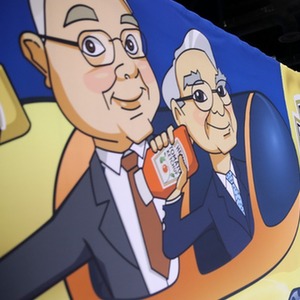 2018年5月4日,在美国内布拉斯加州奥马哈市,参加伯克希尔·哈撒韦公司股东大会的股东们在购物日活动上从印有巴菲特和其投资搭档芒格漫画头像的广告牌前走过。新华社记者王迎摄