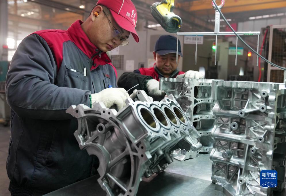 11月29日,工人在河北省顺平县一家汽车发动机缸体企业的生产车间工作。