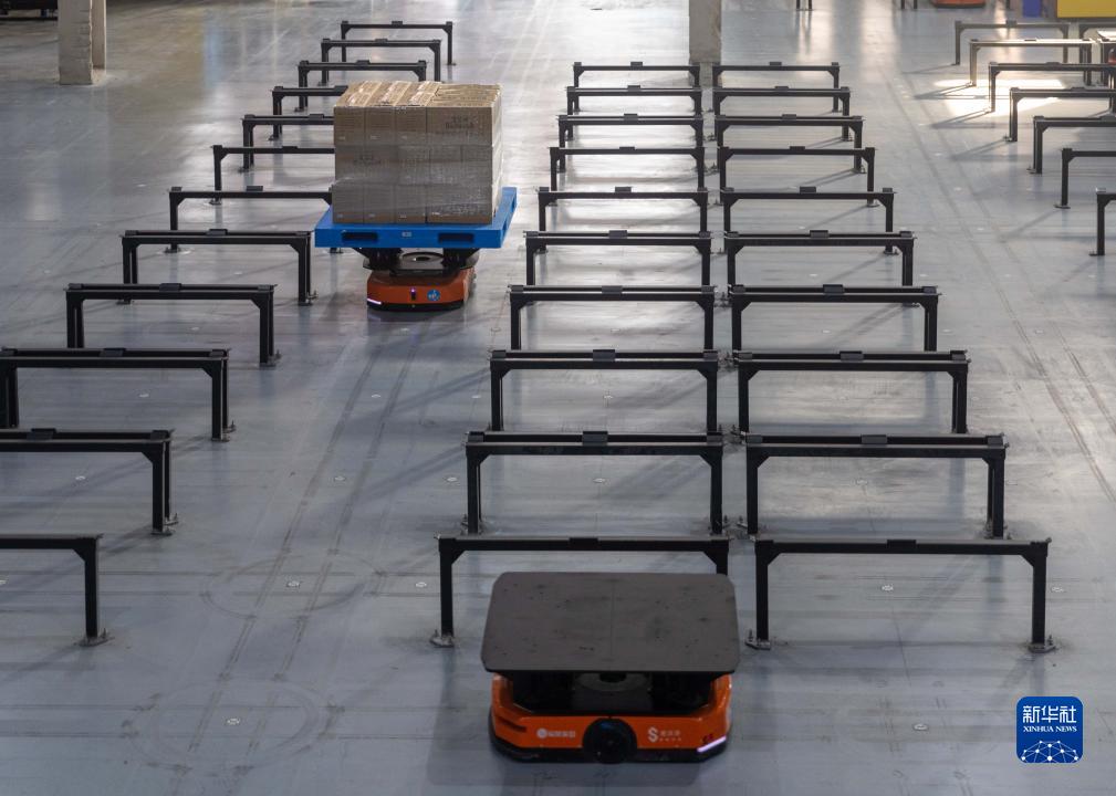 11月28日,5G智能运输车在宠物食品仓库中工作。5G智能运输车可自动匹配需求,实现24小时无人化作业,提升仓储运输效率。