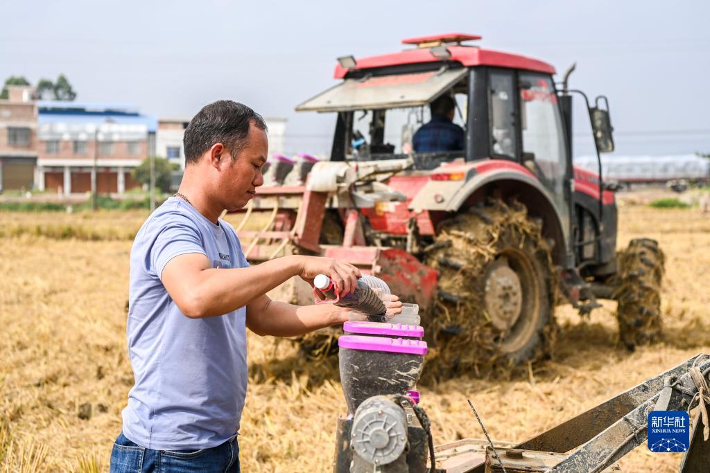 11月29日,在广西贵港市港北区,农机操作手将作物种子装入播撒装置里。