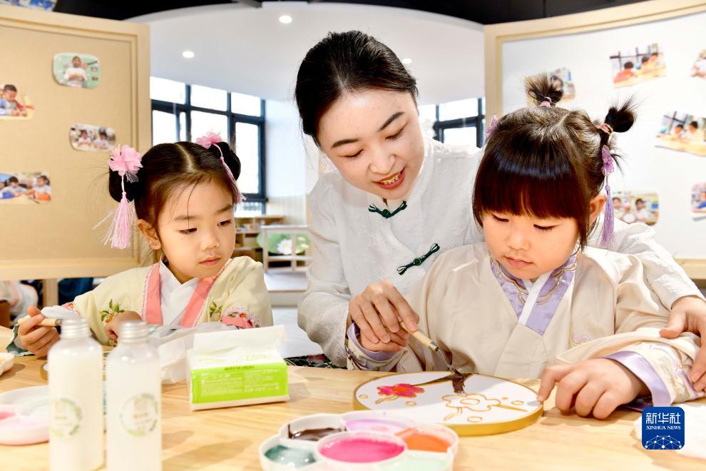 11月29日,在济南市七里山幼教集团山望幼儿园景泰蓝手工坊,陈文君老师教孩子们做手工。
