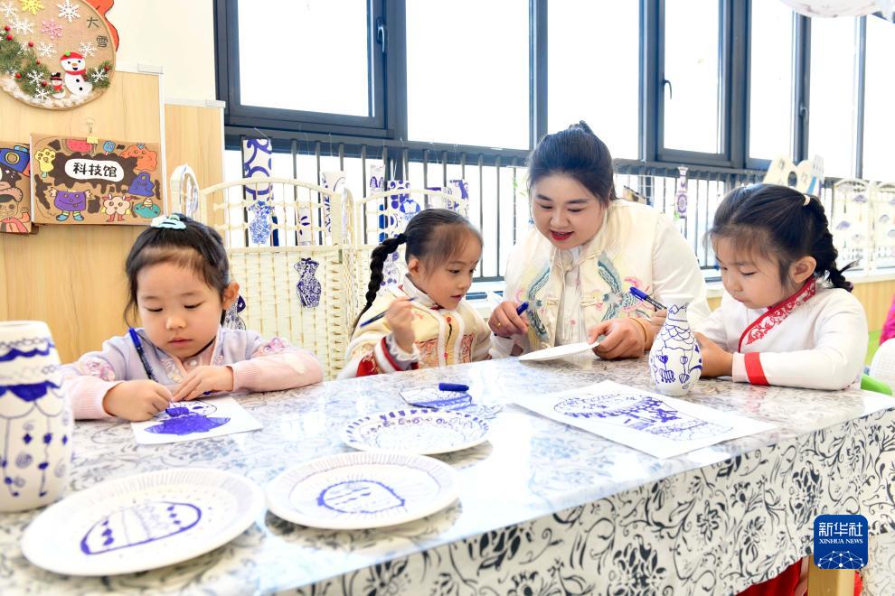 11月29日,在济南市七里山幼教集团山望幼儿园青花瓷手工坊,李天艺老师教孩子们在纸盘上描绘图案。