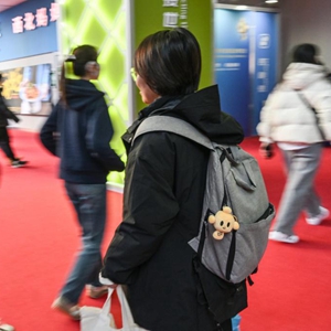 11月29日,一名观展者将挂链款的“链氪”毛绒玩具挂在自己的背包上。