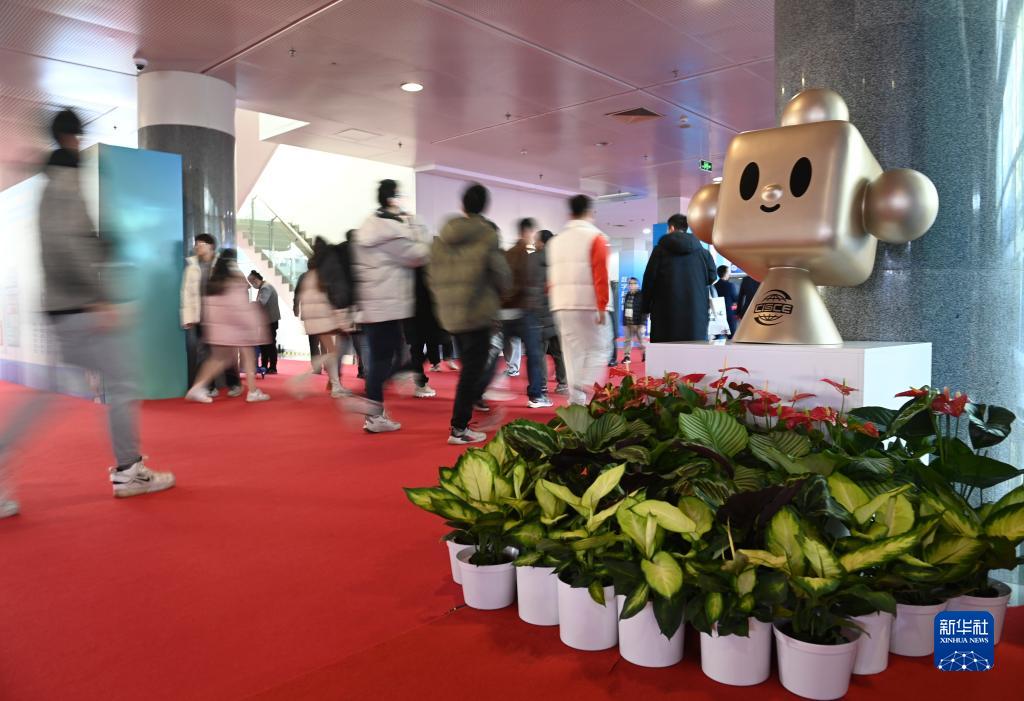 11月29日,链博会展厅入口处摆放着带有“链氪”形象的小花坛引导观展人群。