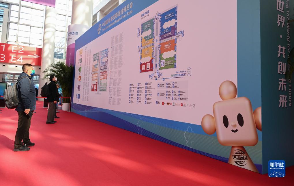 11月29日,链博会会场入口处的地图导引墙上印有吉祥物“链氪”的形象。