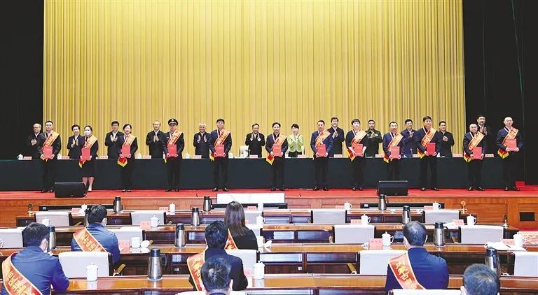 在自治区“担当作为好干部”命名大会上,出席大会的自治区领导为“担当作为好干部”代表颁发奖章和证书。
