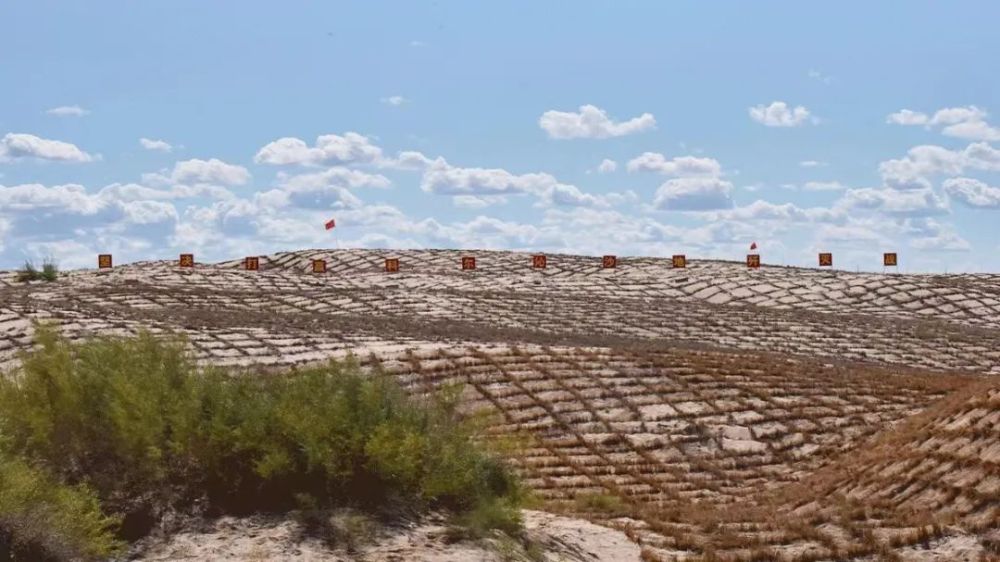为防止乌兰布和与巴音温都尔两大沙漠“握手”,巴彦淖尔市乌拉特后旗探索出“工程固沙+造封飞”系统治理模式,由沙柳、稻草、芦草等10种材料做成的各式沙障铺展在沙地上,构成一道独特的风景。