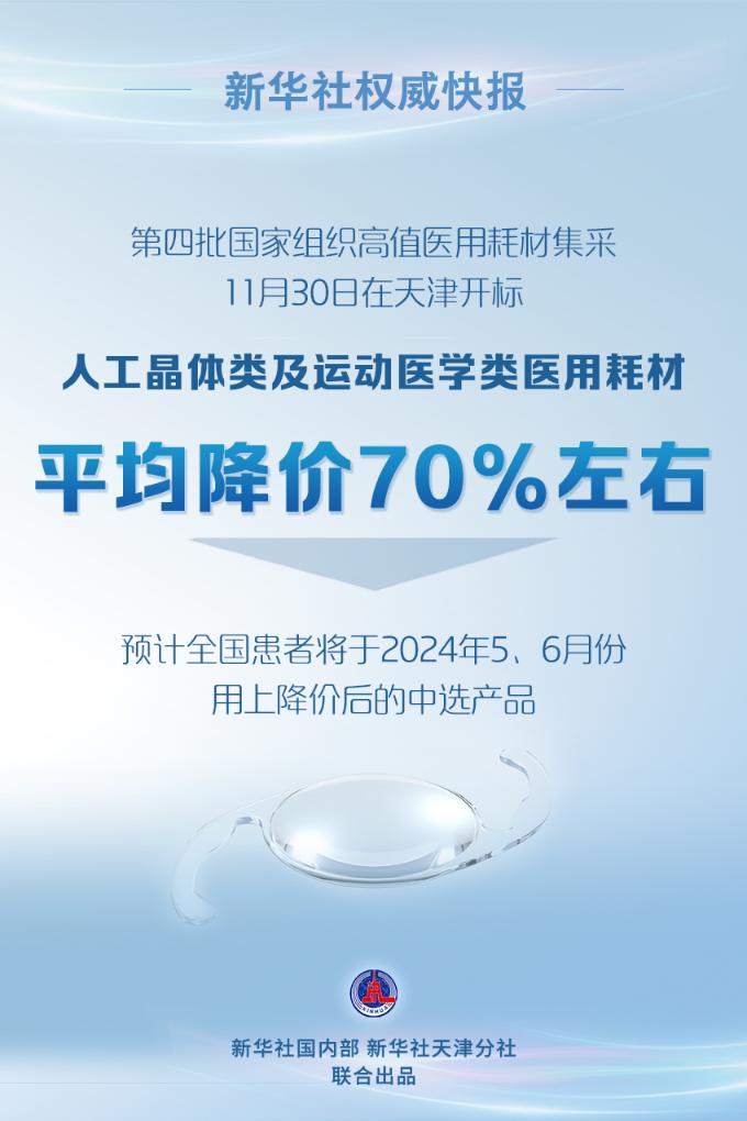 第四批国家组织高值医用耗材集采11月30日在天津开标并产生拟中选结果。此次集采覆盖人工晶体、运动医学相关高值医用耗材。拟中选企业126家,拟中选产品平均降价70%左右,人工晶体类耗材平均降价60%,运动医学类耗材平均降价74%。