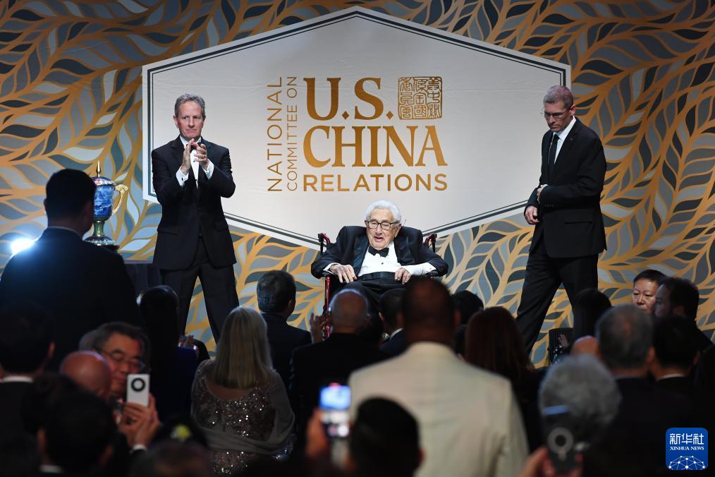 2023年10月24日,美国前国务卿亨利·基辛格(中)出席在纽约举行的美中关系全国委员会年度颁奖晚宴。 新华社记者 李睿 摄