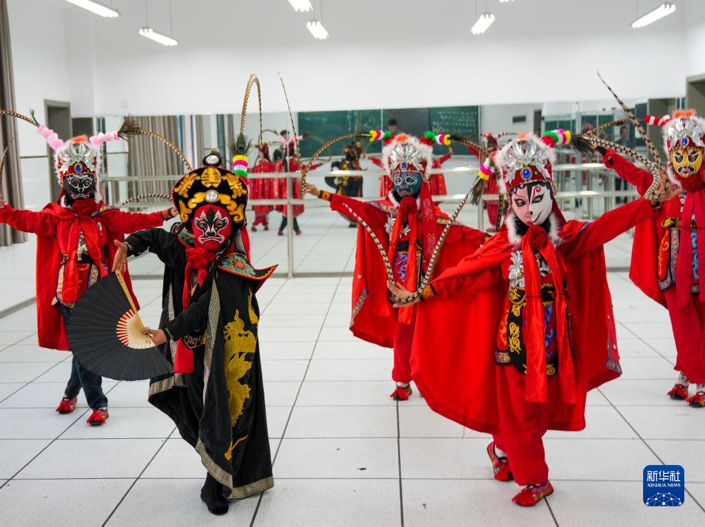 11月28日,在垫江县武安小学校的舞蹈室内,穿戴好全套戏服的学生在进行川剧变脸表演练习。