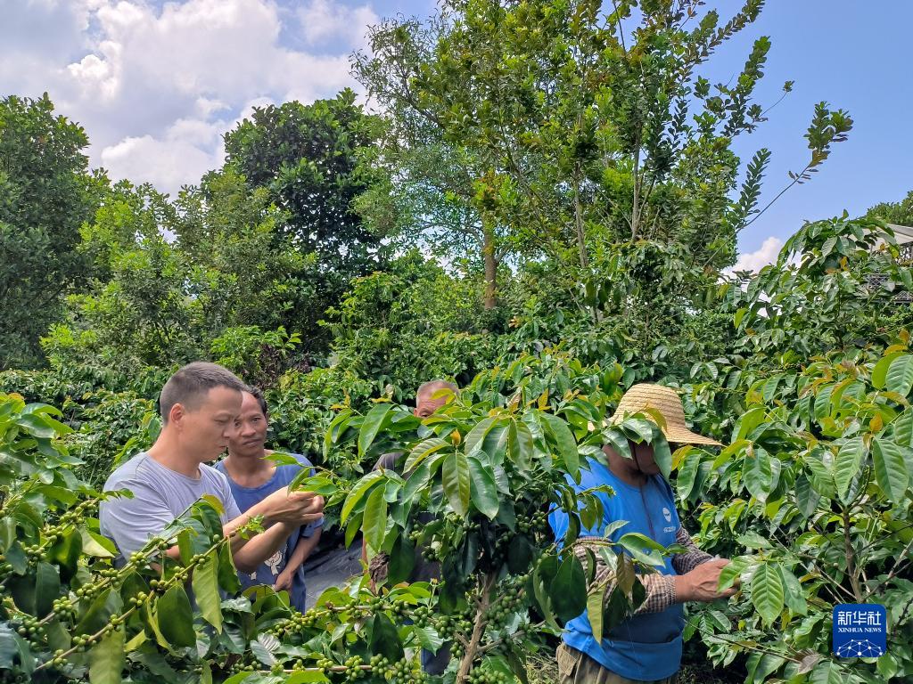 9月7日,农艺师王万东(左一)在云南省普洱市思茅区思茅港镇那澜村向咖农传授防治咖啡天牛方法。