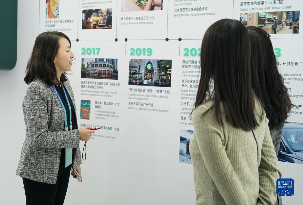 工作人员(左)在首届中国国际供应链促进博览会现场向观众介绍星巴克的咖啡产业链(11月28日摄)。