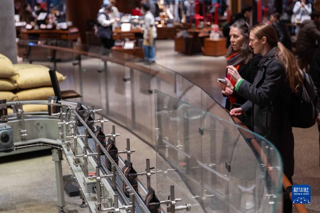 11月24日,顾客在星巴克臻选上海烘焙工坊观看咖啡豆包装流水线。