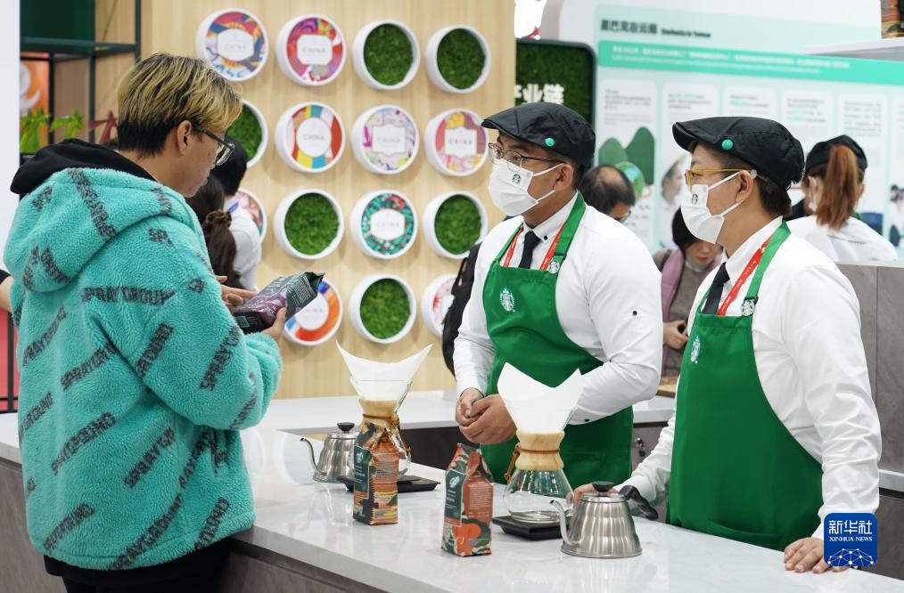 近日,首届中国国际供应链促进博览会在北京开幕,参展的星巴克咖啡展位位于链博会健康生活链展区,吸引了许多参观者前来了解咖啡产业链和咖啡豆等产品。