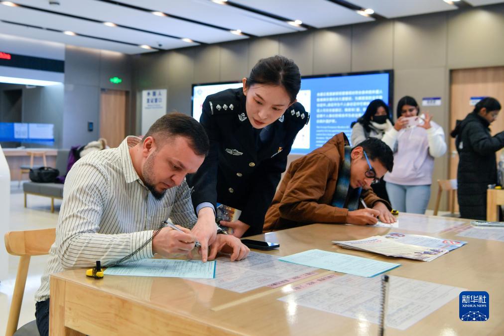 12月1日,天津市公安局出入境管理局的民警指导外籍人士填写“五星卡”申请表格。