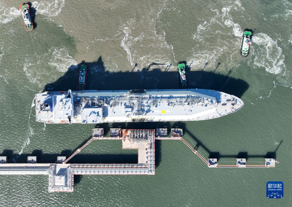 12月1日,“少林”号LNG运输船正在靠泊中国石化天津LNG接收站2号泊位(无人机照片)。
