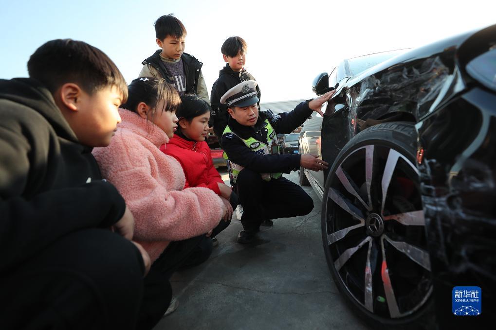 12月1日,河南省商丘市雷庄小学的学生在睢阳区雷庄交通事故车辆停车场参加“文明交通 你我同行”主题活动。