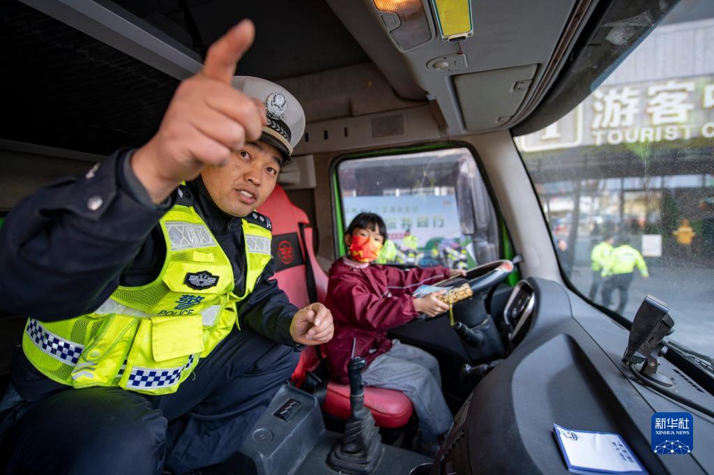 12月1日,在浙江省金华市金华之光文化广场,学生在大货车驾驶室体验盲区。