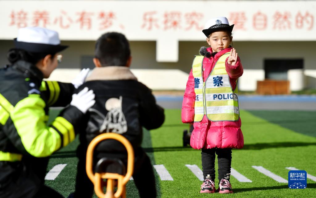 12月1日,河北省石家庄市井陉矿区区直第二幼儿园的小朋友跟着交警学习交通安全知识。