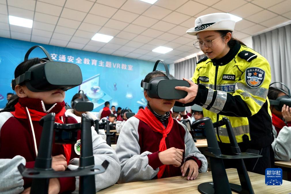 12月1日,江苏省盐城市滨海县行知实验小学的学生们进行交通安全VR体验。