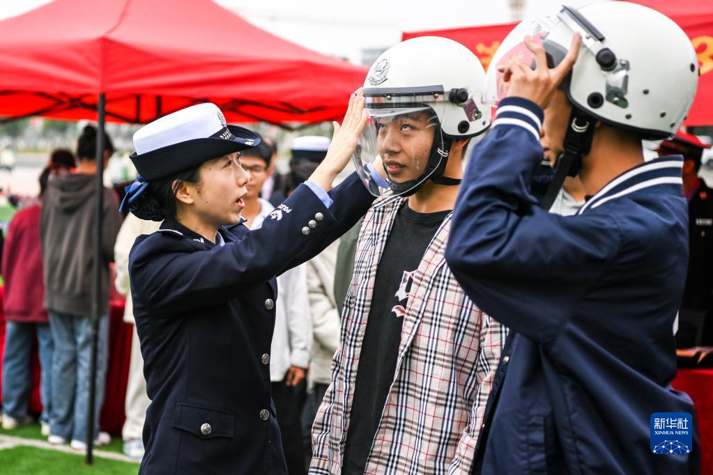 12月1日,在广西物流职业技术学院,贵港市公安局交警支队民警教学生如何正确佩戴头盔。