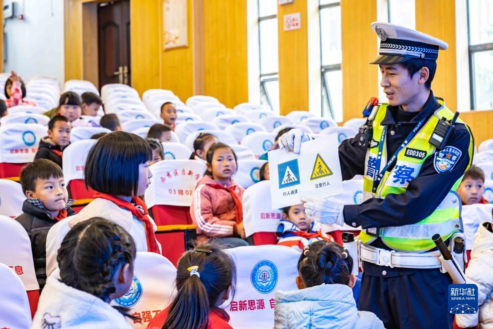 12月1日,交警在贵州省安顺市西秀区启新学校为学生讲解交通安全知识。