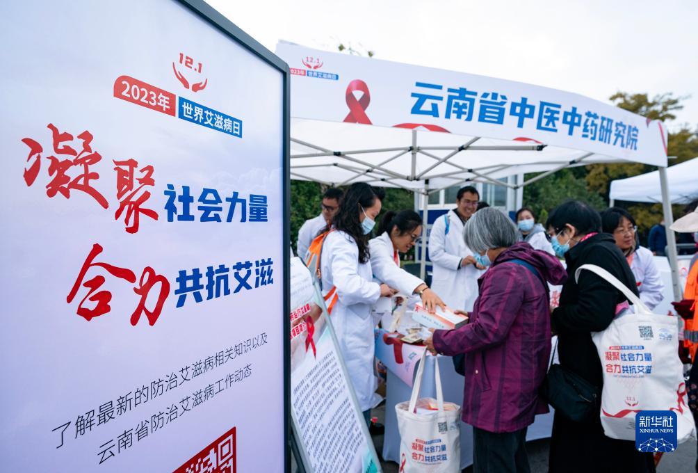 12月1日,工作人员在2023年世界艾滋病日云南省主题宣传月活动上向人们进行宣传。