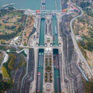 12月1日,船舶有序通过三峡双线五级船闸(无人机照片)。