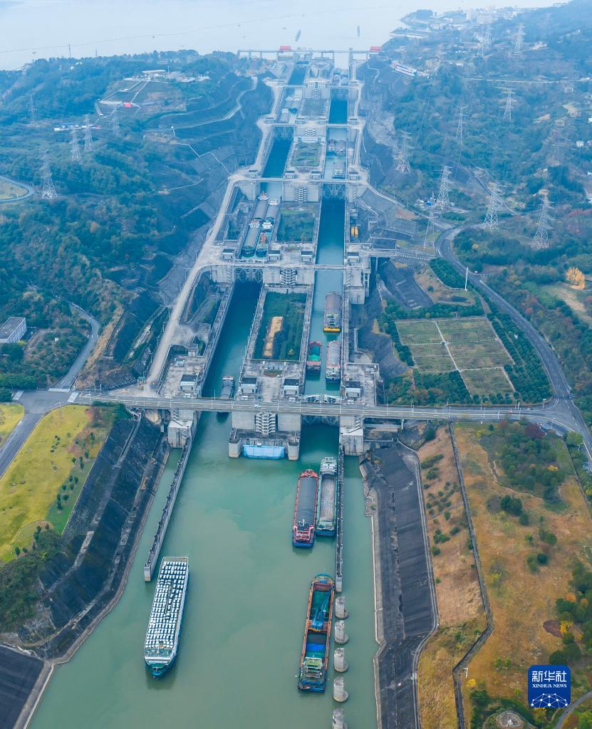 12月1日,船舶有序通过三峡双线五级船闸(无人机照片)。