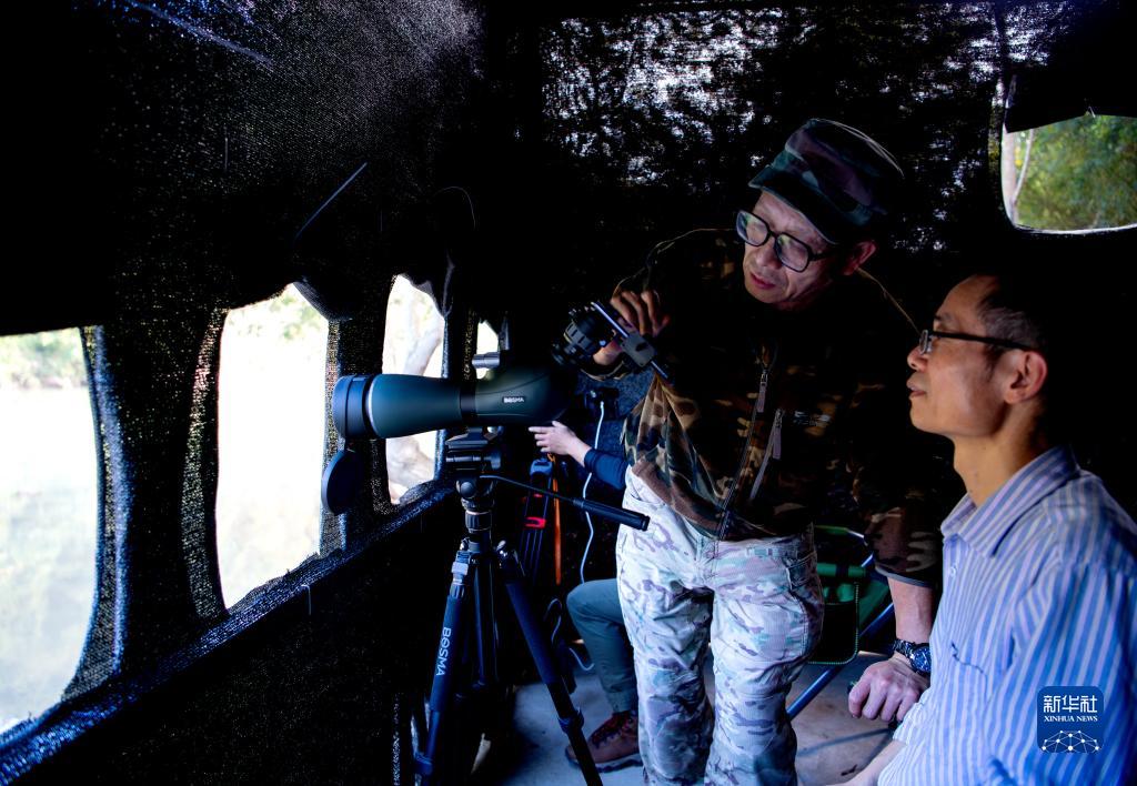 在位于永泰县嵩口镇的中华秋沙鸭观测拍摄基地,陈林(左)与县林业部门工作人员在观测鸟类(11月29日摄)。