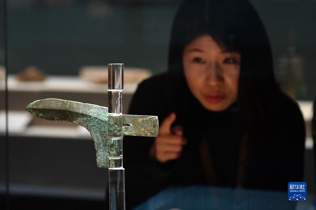 12月1日,观众在长沙博物馆“晋国霸业——山西出土两周文物精华展”参观展品王子于戈。