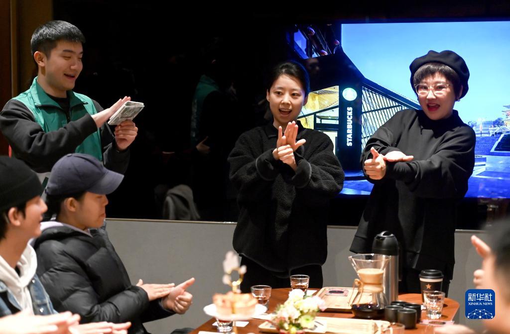 11月30日,李莎(右二)在星巴克手语课堂上教学。