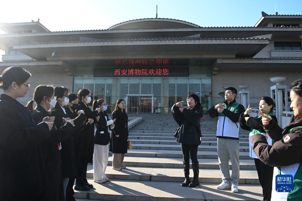 11月30日,李莎(右二)和几位星巴克听障咖啡师在西安博物院对讲解员进行通用手语培训。