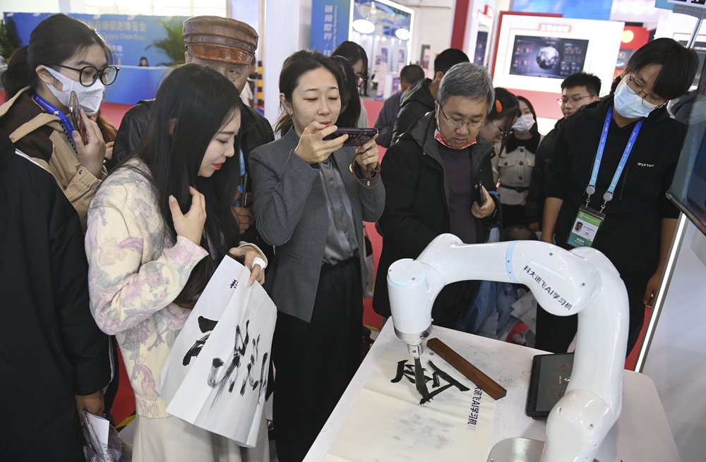 参观者在首届中国国际供应链促进博览会数字科技链展区科大讯飞展位观看一款AI书法机器人写毛笔字(2023年12月2日摄)。新华社记者 蔡湘鑫 摄