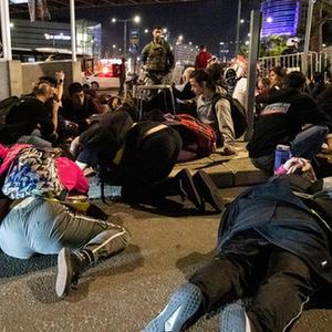12月2日,在以色列城市特拉维夫,防空警报响起时,身处室外的人们降低身位避难。