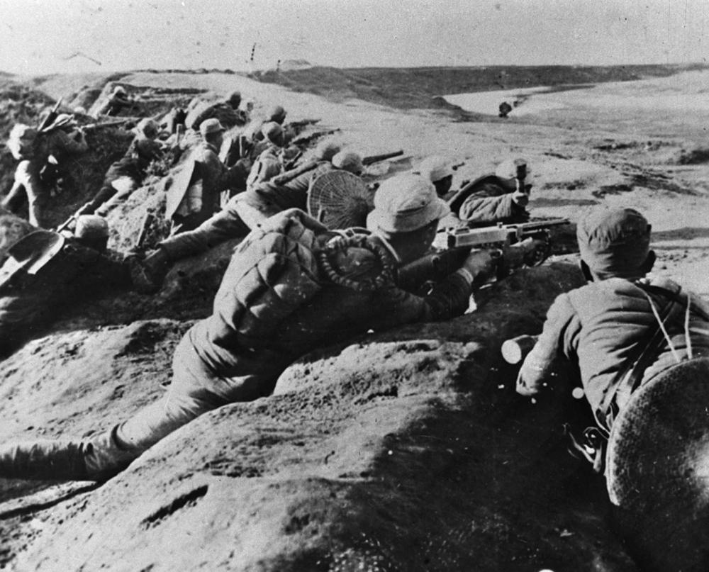 ↑ 新四军战士在马家园战斗中射击敌人。