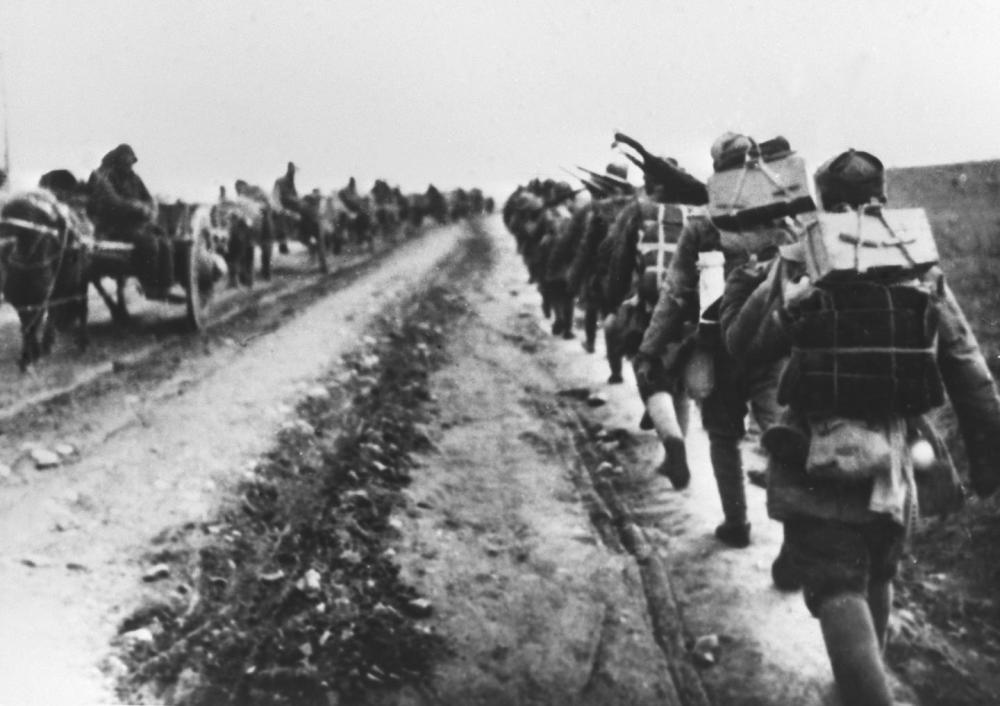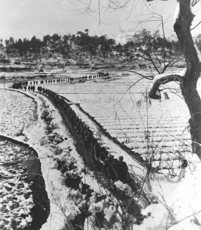 ↑ 抗日战争期间,新四军在苏北冰天雪地中行进。