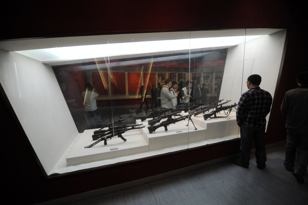 ↑ 观众在盐城新四军纪念馆内参观枪支等实物展品(2011年5月26日摄)。