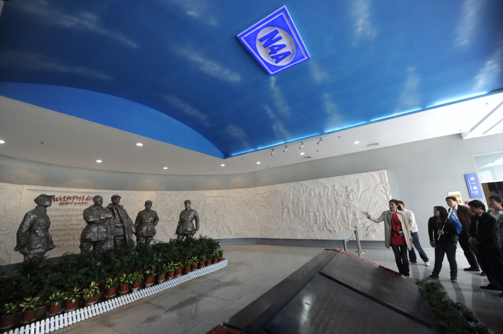 ↑ 在盐城新四军纪念馆,讲解员在向观众介绍展厅入口处的浮雕和塑像(2011年5月27日摄)。