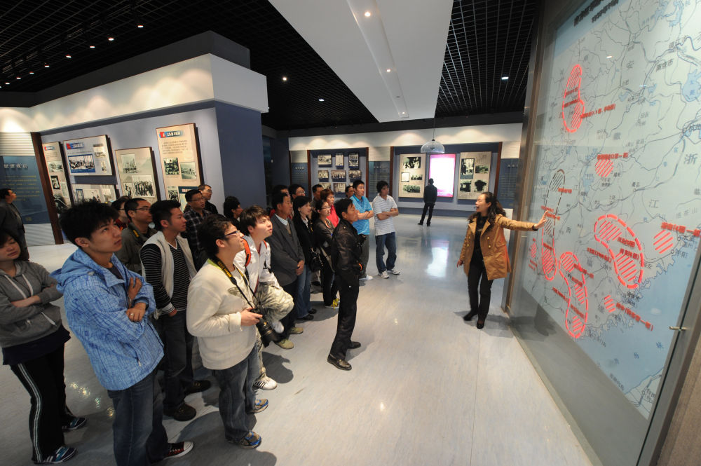 ↑ 在盐城新四军纪念馆内,讲解员在向观众介绍南方红军游击队整编为新四军示意图(2011年5月26日摄)。