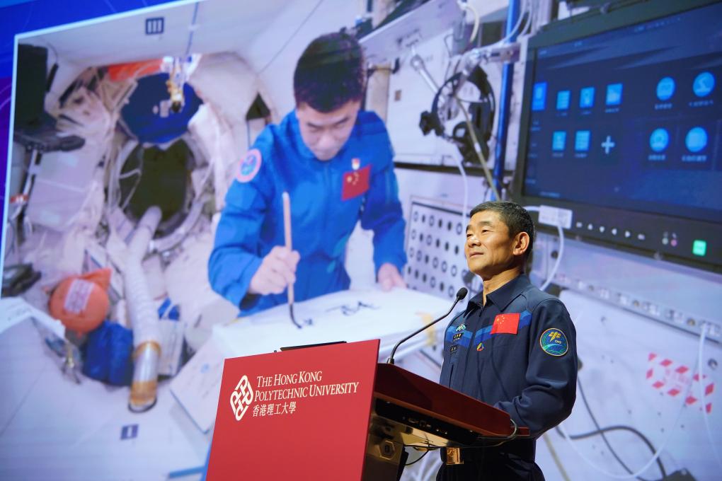 11月30日,神舟十二号乘组航天员刘伯明在香港理工大学分享。新华社记者 吕小炜 摄