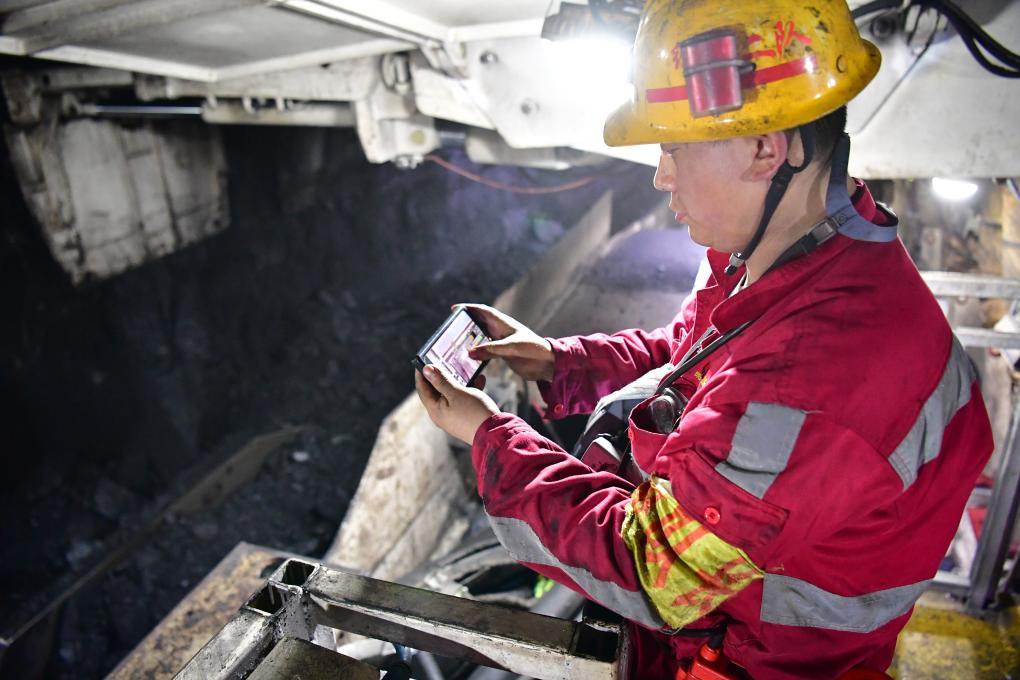 在曹家滩智慧矿山智能化工作面内,综采二队机电副队长蔡进通过操作手机控制生产设备(2021年10月12日摄)。新华社记者 邵瑞 摄