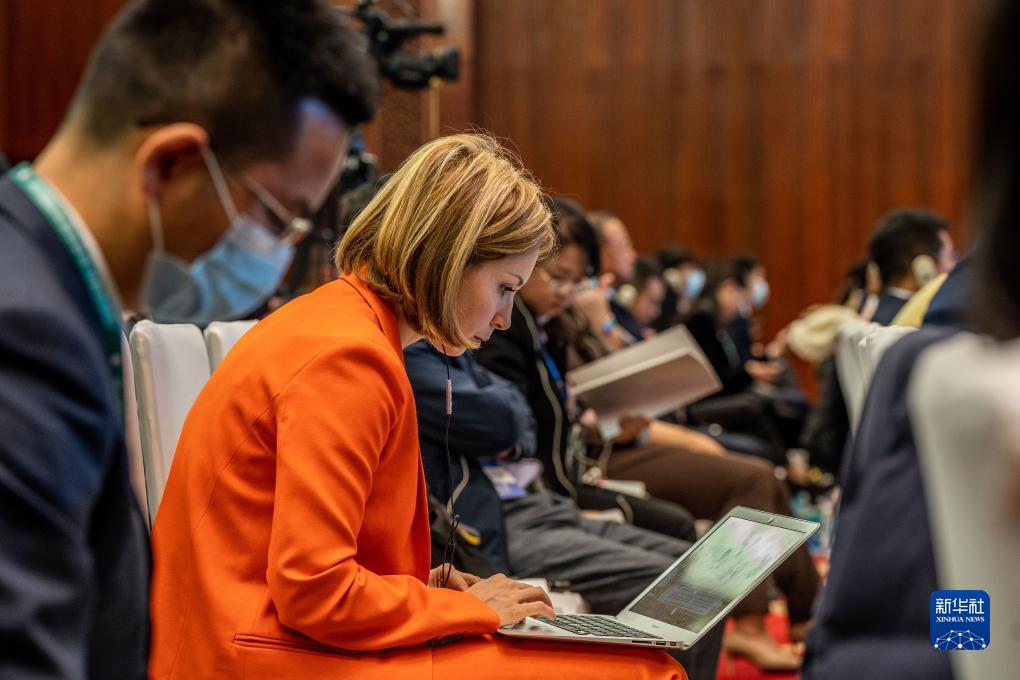 12月5日,记者在云南昆明采访第五届世界媒体峰会(云南分会场)暨第二届大象国际传播论坛开幕式。新华社记者 胡超 摄