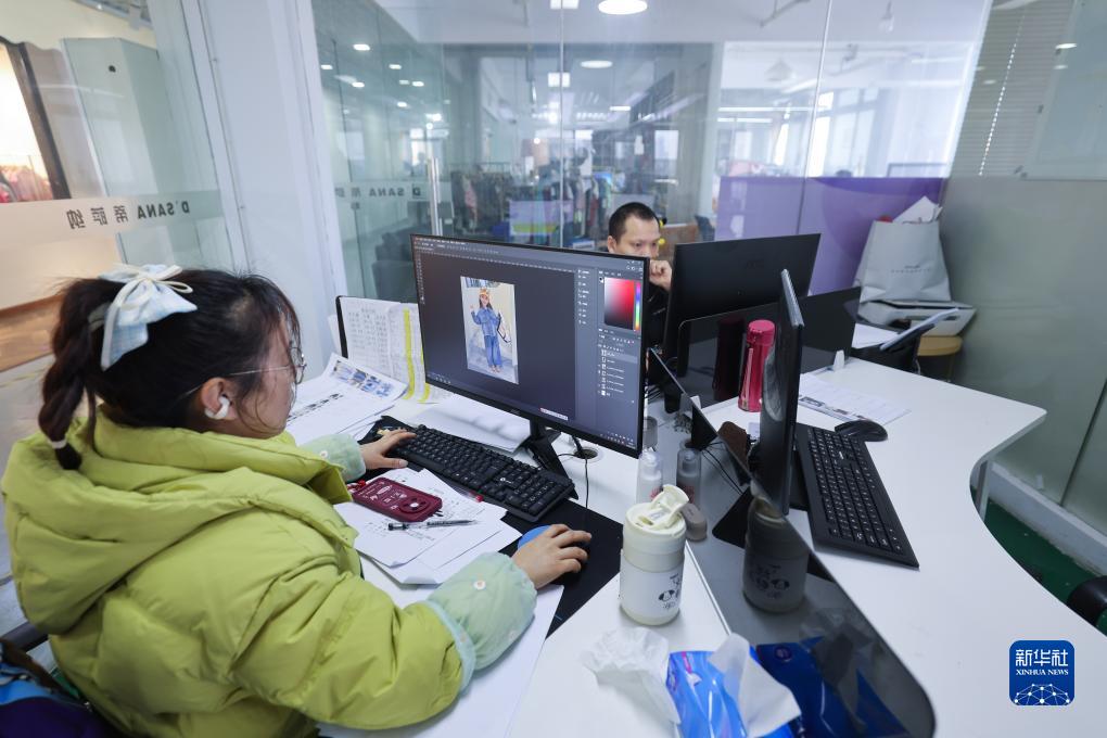 12月5日,在位于织里镇的湖州南童魔服饰有限公司内,设计师正在电脑上看童装效果图。该企业童装出口欧美、日韩等国家和地区,日均出口童装3000件,其名下品牌“蒂萨纳”在韩国首尔开设6家门店。