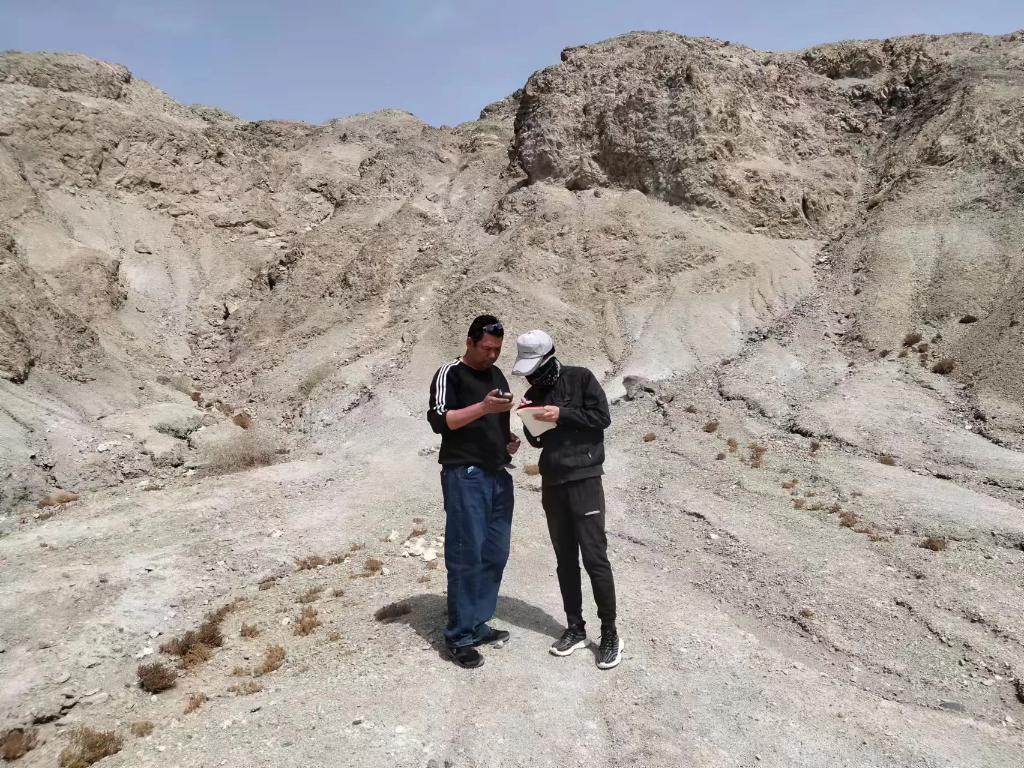吾甫尔·库尔班(左一)和同事在巡护烽燧途中。(受访者供图)