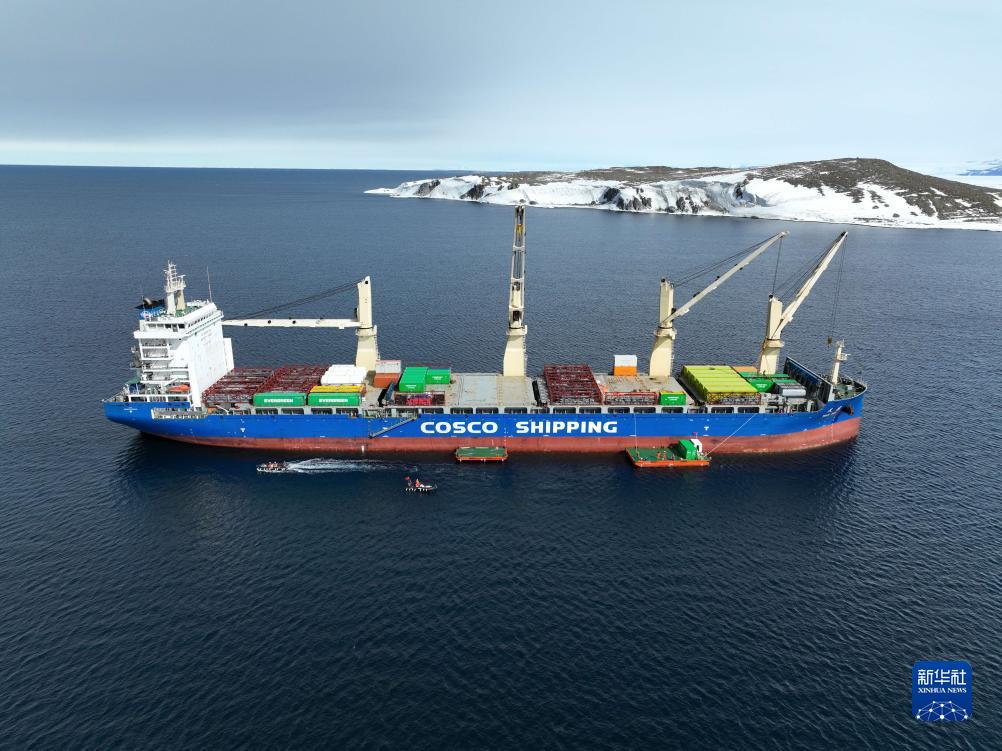 12月7日,执行中国第40次南极考察任务的“天惠”轮开展卸货作业(无人机照片)。新华社发(王海楠 摄)