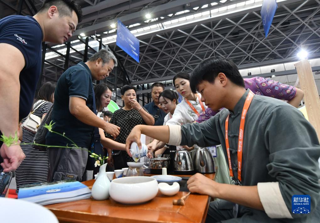 在南宁国际会展中心,观众在中国—东盟博览会上品饮六堡茶(9月19日摄)。