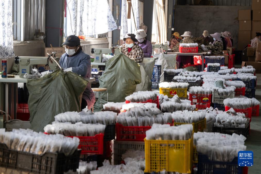 12月7日,在蕲春县高新铺村的就业帮扶车间,工人在加工蕲艾产品。